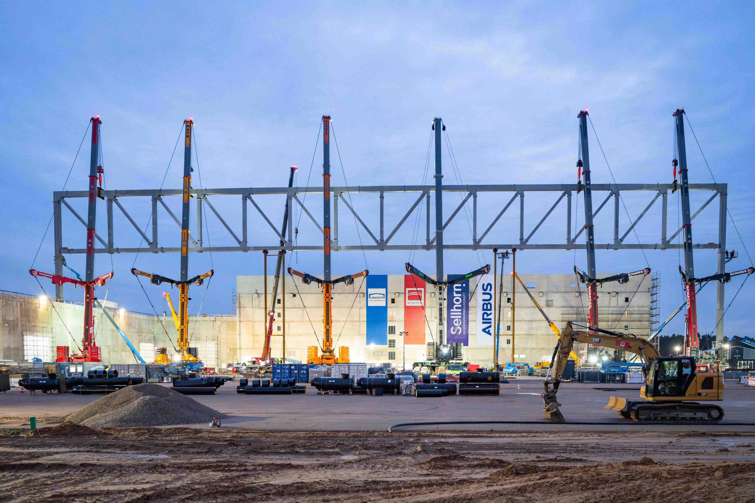 Um 3 Uhr in der Nacht des 10. Dezembers erfolgte der spektakuläre Hub des ersten von zwei Hauptfachwerken für den neuen Flugzeughangar in Wunstorf.