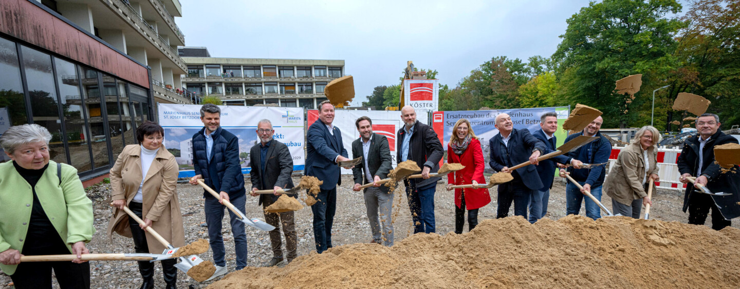 Gute Stimmung beim Spatenstich am 7. Oktober 2025 in Betzdorf: (V.l.) Mathilde Jüngst, Vorsitzende des Fördervereins; Mechele Klein, ehemalige Einrichtungsleiterin; Daniel Blaufuß, Geschäftsbereichsleitung Altenhilfe und Prokurist der Marienhaus Senioreneinrichtungen GmbH; Andreas Helsper, Architekt/Projektverantwortlicher des Marienhaus Baumanagement; Joachim Brenner, Verbandsgemeindebürgermeister; Johannes Behner, Stadtbürgermeister; Sebastian Schmeier, Geschäftsführer der Marienhaus Senioreneinrichtungen GmbH; Sabine Bätzung-Lichtenthäler, SPD-Landtagsabgeordnete und Fraktionsvorsitzende; Alexander Schuhler, Geschäftsführer der Marienhaus GmbH; Benjamin Geldsetzer, Kreisbeigeordneter; Kevin Preuß, Einrichtungsleiter; Pia Pfeifer-Irle, Pflegedienstleiterin; Heinfried Januschewski, Geschäftsführer des Generalübernehmers Köster GmbH. Bildquelle: Köster GmbH
